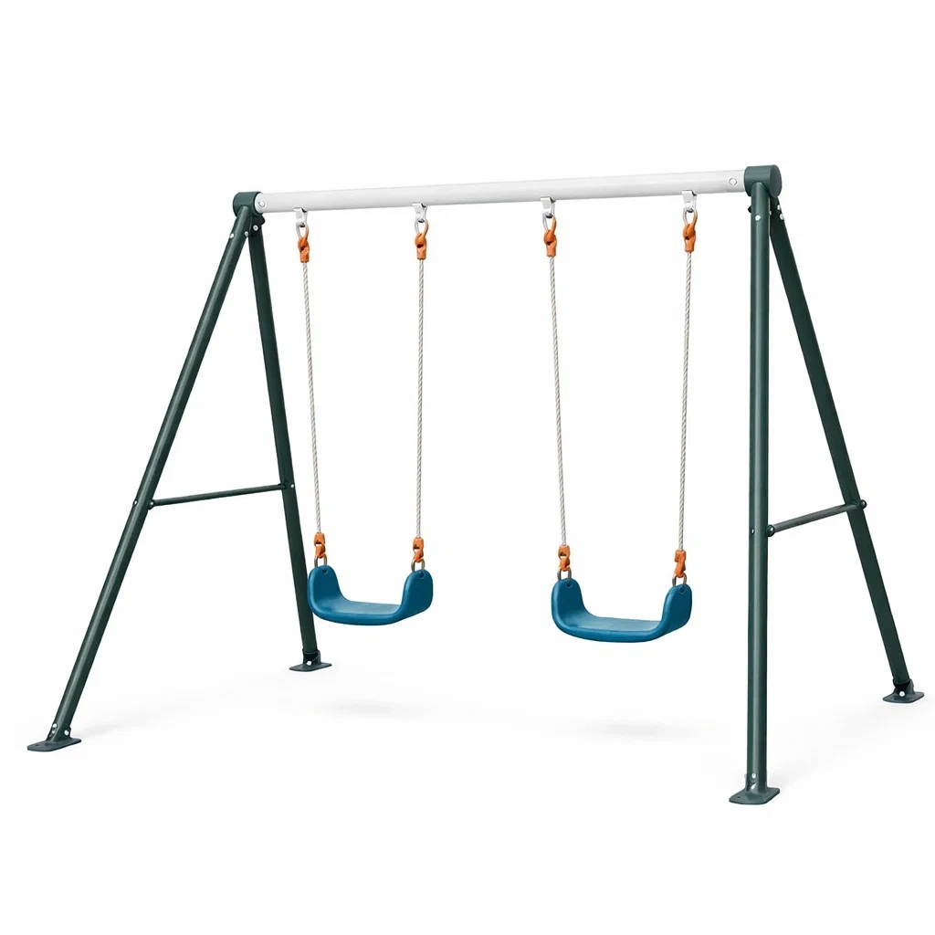 Diese Doppelschaukel besteht aus einem pulverbeschichteten Stahlrahmen, Polyesterseilen und Polyethylen-Sitzen. Sie ist für Kinder im Alter von 3 bis 12 Jahren geeignet. Jeder Sitz kann bis zu 50 kg tragen. Der Sicherheitsstandard EN 71 gewährleistet sichere Nutzung unter Aufsicht von Erwachsenen. Das Set umfasst 2 Schaukelsitze und einen Rahmen.