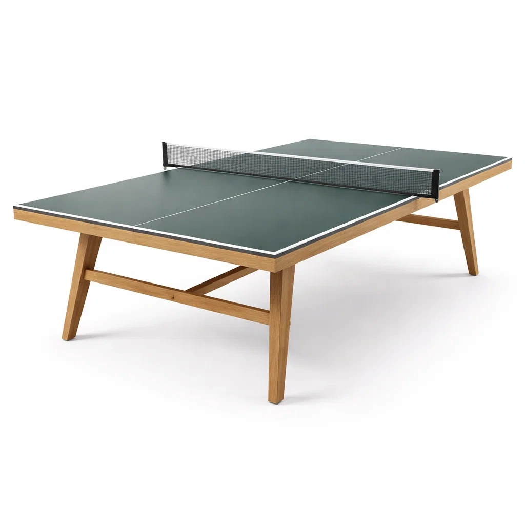 Die Tischtennisplatte hat eine grüne Spieloberfläche aus lackiertem MDF und steht auf einem stabilen Gestell aus Massivholz. Das Netz ist enthalten. Die Abmessungen betragen 274 cm in der Länge, 152.5 cm in der Breite und 76 cm in der Höhe. Die Platte wiegt 40 kg.