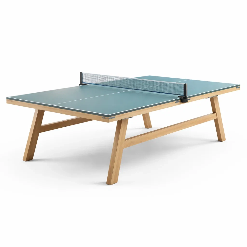 Die Tischtennisplatte besteht aus mitteldichter Faserplatte (MDF) und einem Massivholzgestell.